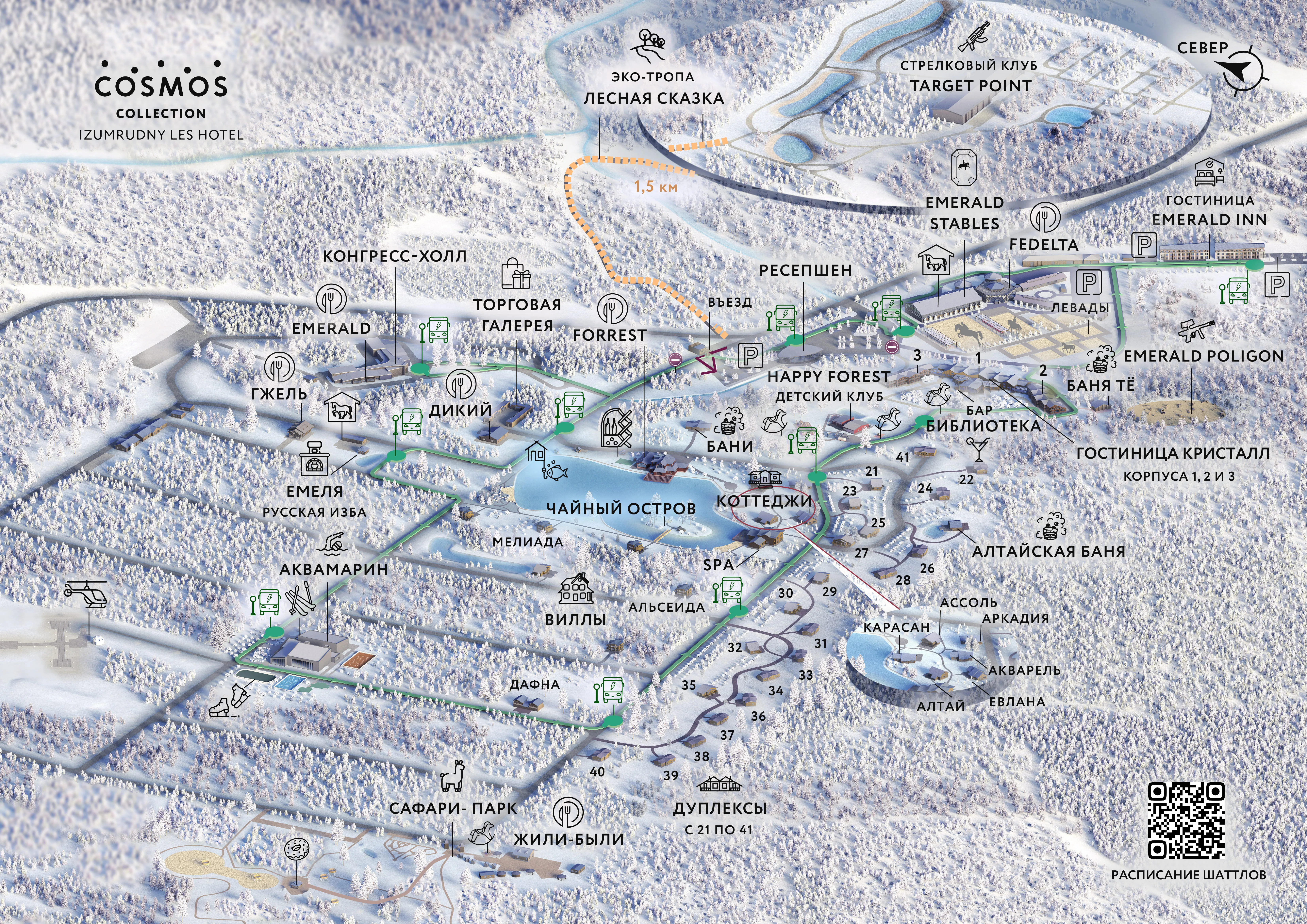 Cosmos Collection Izumrudny Les — современный пятизвездочный загородный отель, расположенный в лесной зоне Подмосковья. Комплекс занимает территорию площадью 220 гектаров и предлагает 137 номеров различных категорий: от уютных студий до роскошных вилл у озера.