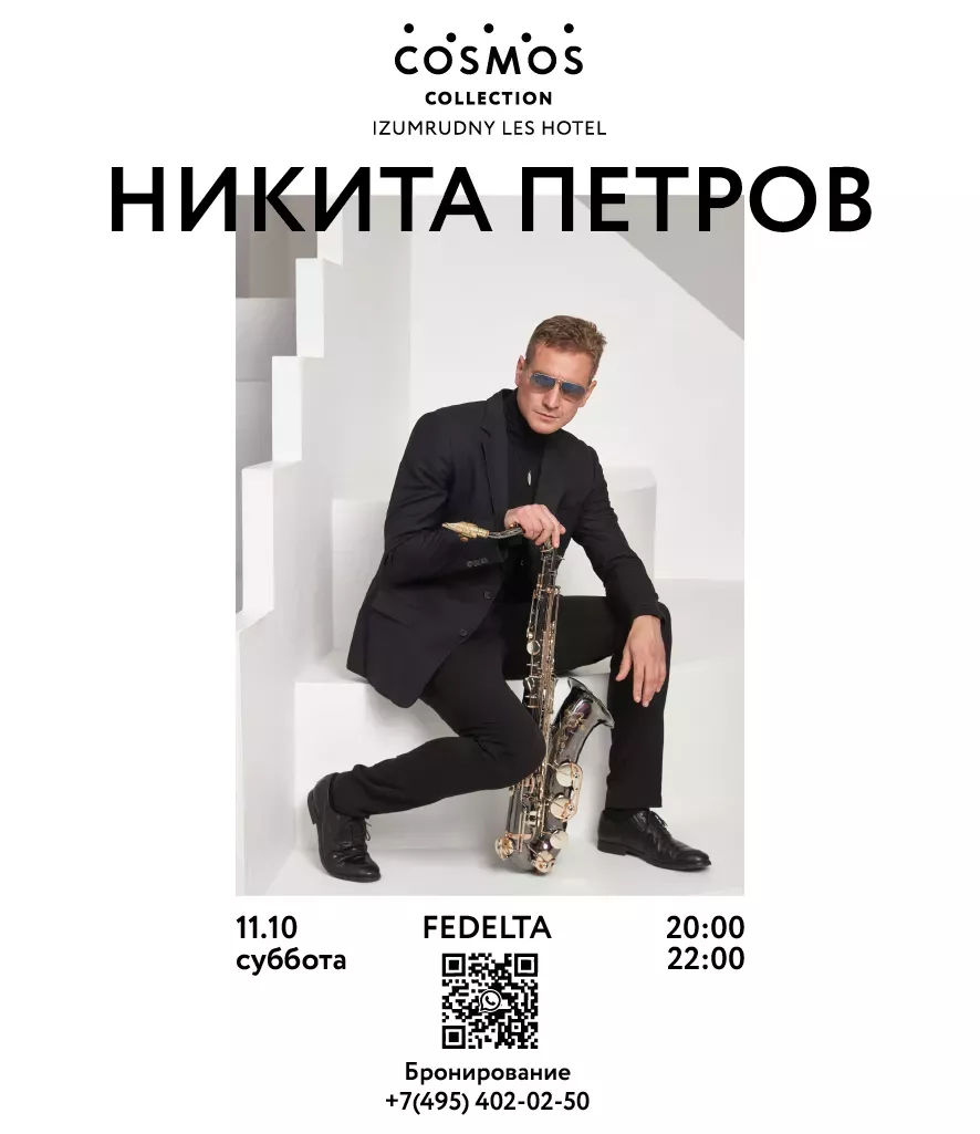 Приглашаем вас на концерт на живой концерт Никиты Петрова. На сцене в исполнении саксофона прозвучат легендарные джазовые композиции и современные мировые хиты.