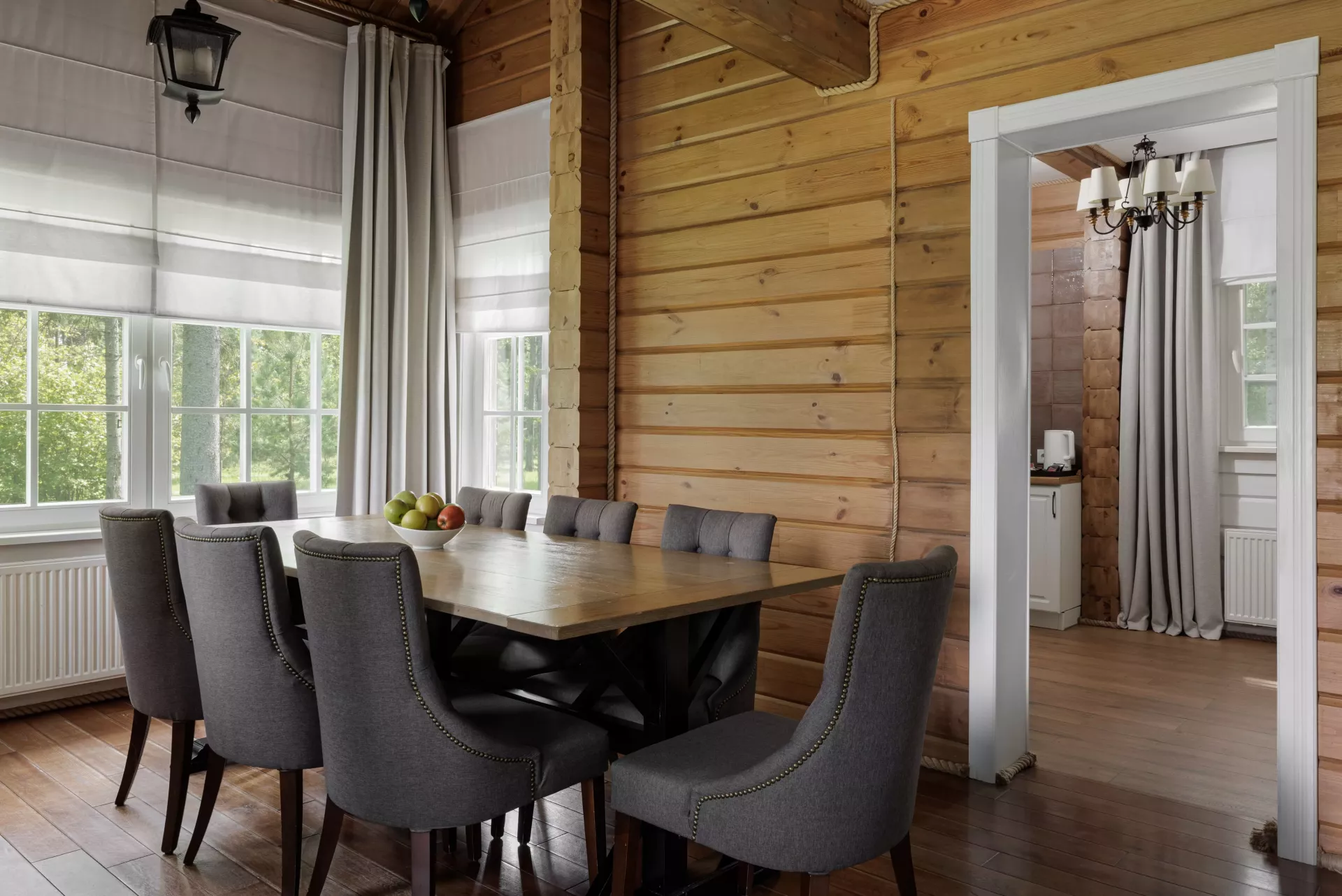 Одним из ключевых элементов пространства является деревянная лестница. Мебель из натурального дерева, текстиль в пастельной цветовой гамме и бронзовые светильники — деликатная роскошь для идеального отдыха на природе.