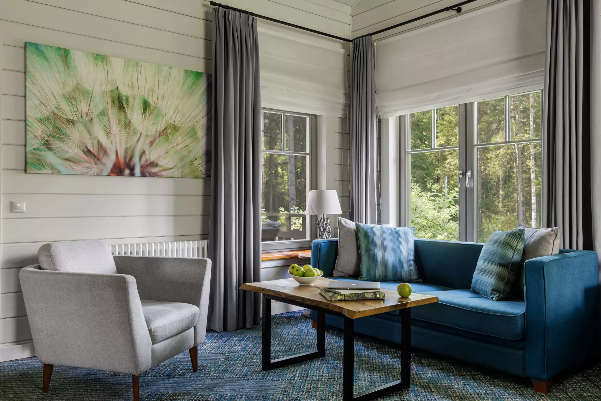 Этот просторный и элегантный однокомнатный номер площадью 60 м² включает в себя объединенную прихожую и гостиную зону с журнальным столиком и креслами, плавно переходящую в спальную комнату. Дизайн интерьера выполнен в спокойных, гармоничных тонах, сочетая натуральные материалы и современные элементы.