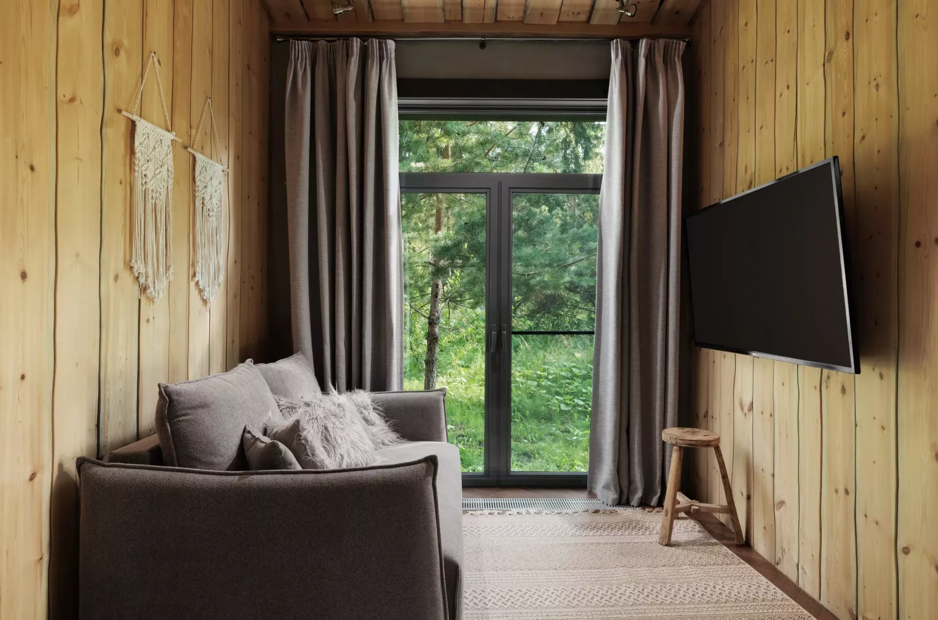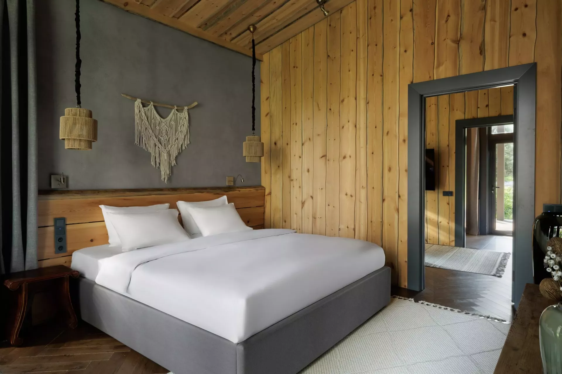 В спальне размещена комфортабельная двуспальная кровать, которая обеспечит гостям отличный сон и максимальное удобство. Гостиная в номере разделена на две зоны. В одной части находится кухонная зона, во второй части расположен уголок для отдыха, где гости могут расслабиться и насладиться проживанием.