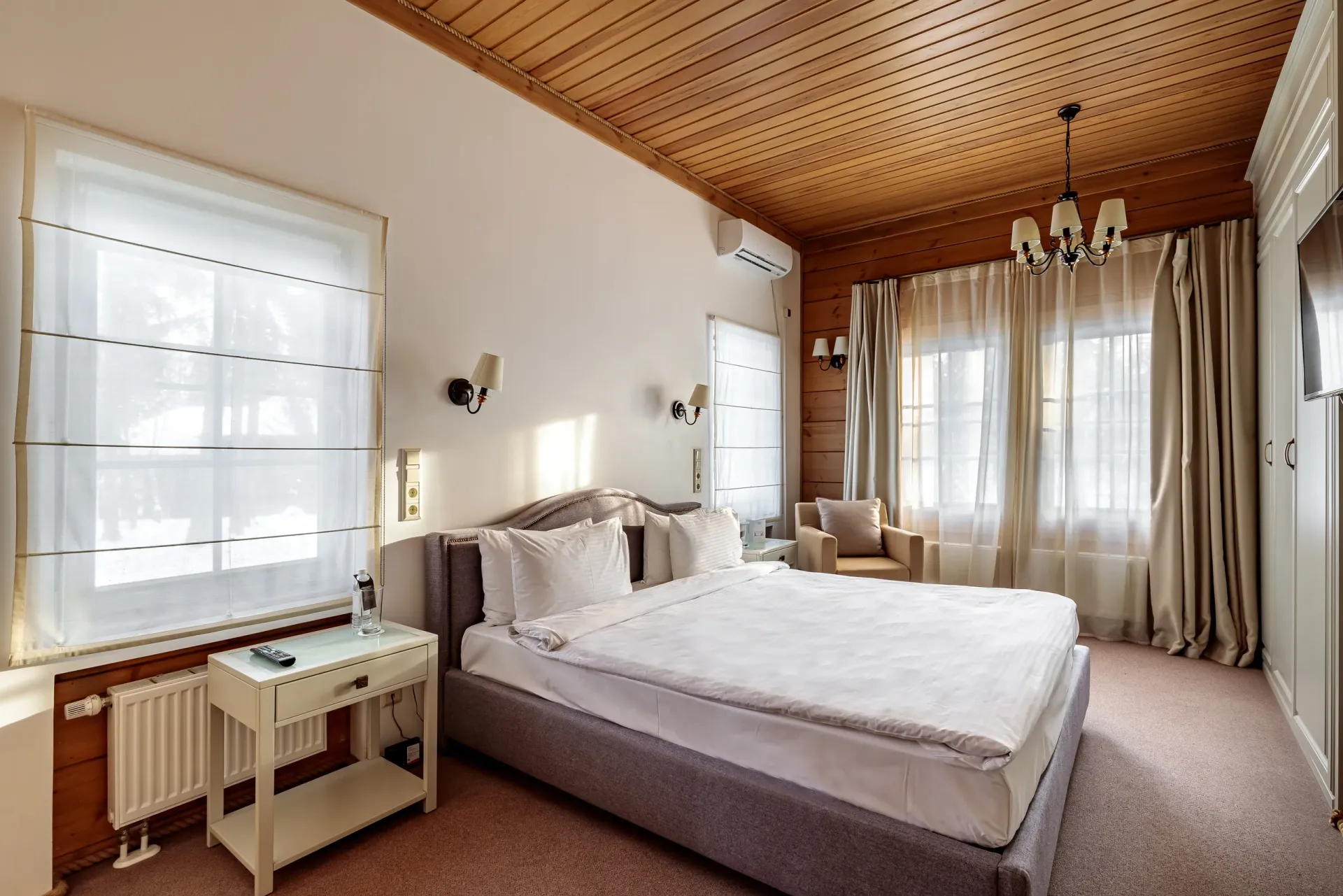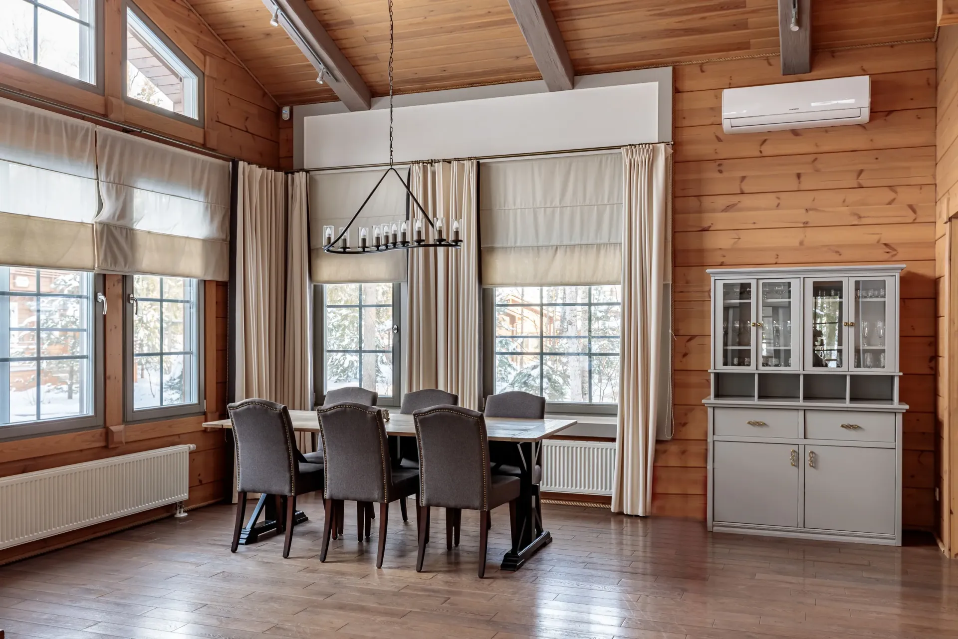 Простой и понятный дизайн, просторные и свободные пространства, а также преобладание светлых оттенков и натуральных текстур — умиротворяющая атмосфера уединенного отдыха в окружении природы. Большие окна наполняют пространство естественным светом и создают ощущение единения с лесным пейзажем.