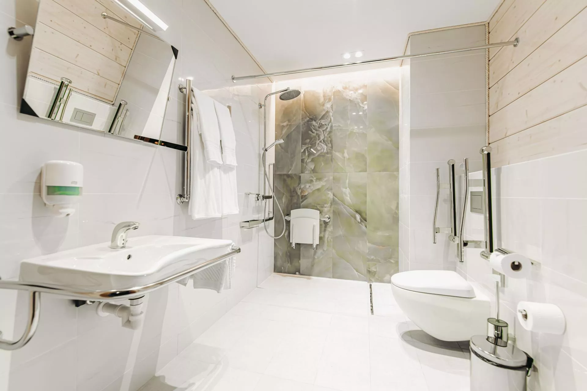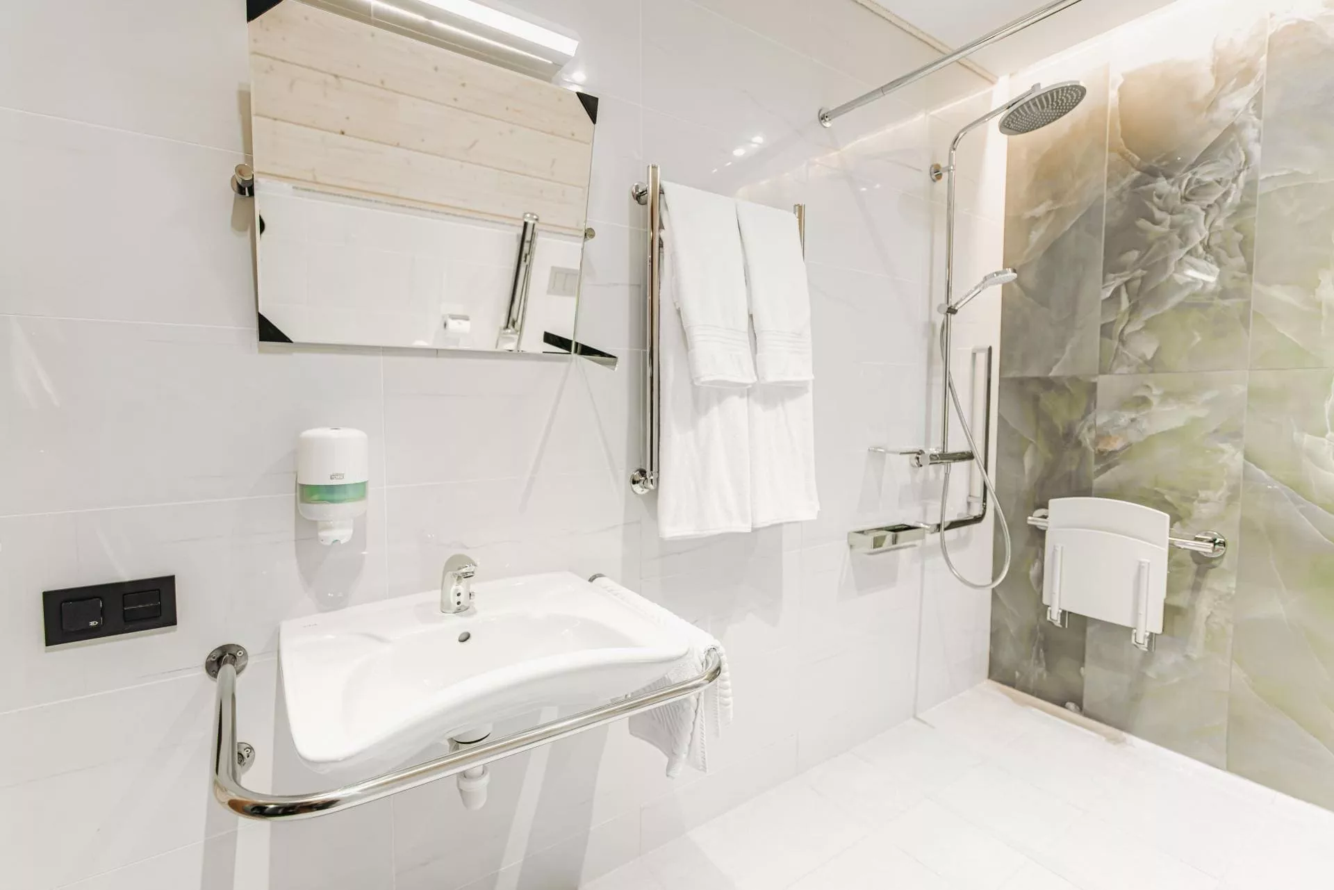 Просторный двухместный номер оборудован мягкой двуспальной кроватью или двумя односпальными кроватями. Особое внимание уделено доступности: расширенные дверные проемы и адаптированная входная зона в номер, специально оборудованная ванная комната с поручнями для рук и заниженным санузлом. Предоставляется круглосуточная помощь сотрудников гостиницы.