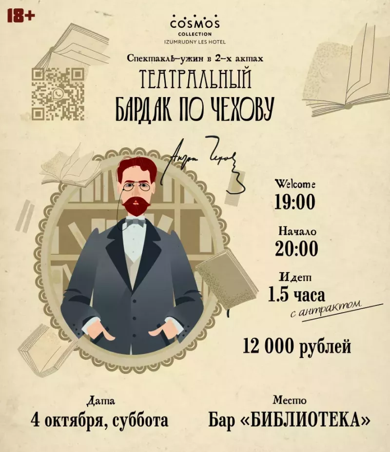 Cosmos Collection Izumrudny Les Hotel и проект «ТЕАТР ИСТОРИЙ» приглашают вас на уникальный гастрономический перформанс, где чеховская ирония сервируется блюдами изысканной кухни.