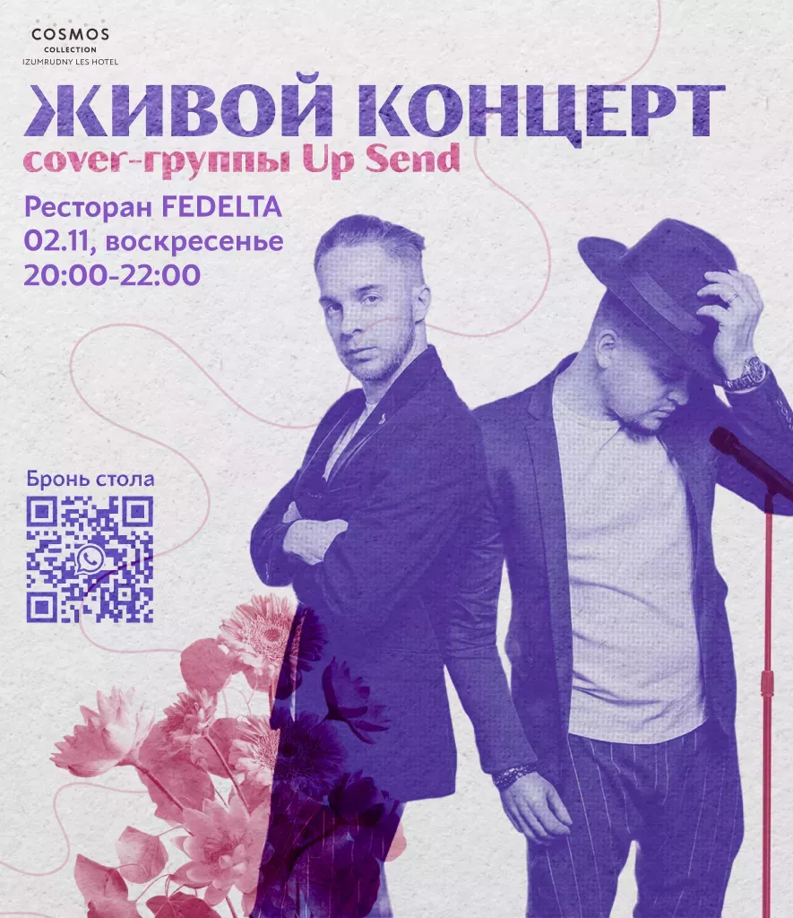 Приглашаем вас на вечер живой музыки с дуэтом UP SEND — двумя талантливыми музыкантами, которые создают по-настоящему особую атмосферу.