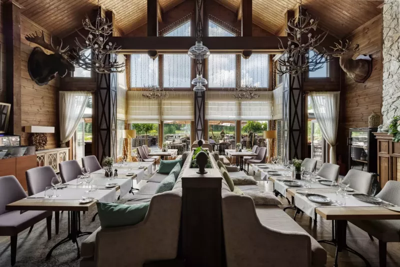 Двухэтажное деревянное здание в скандинавском стиле с верандой открывает панорамные виды на первозданные лесные пейзажи, создавая атмосферу уюта и спокойствия. Все здесь говорит о любви к природе. Внутреннее пространство ресторана оформлено из натуральных материалов. Дерево, камни, тепло камина словно оживают, рассказывая свои истории, и делятся с вами тайнами леса.